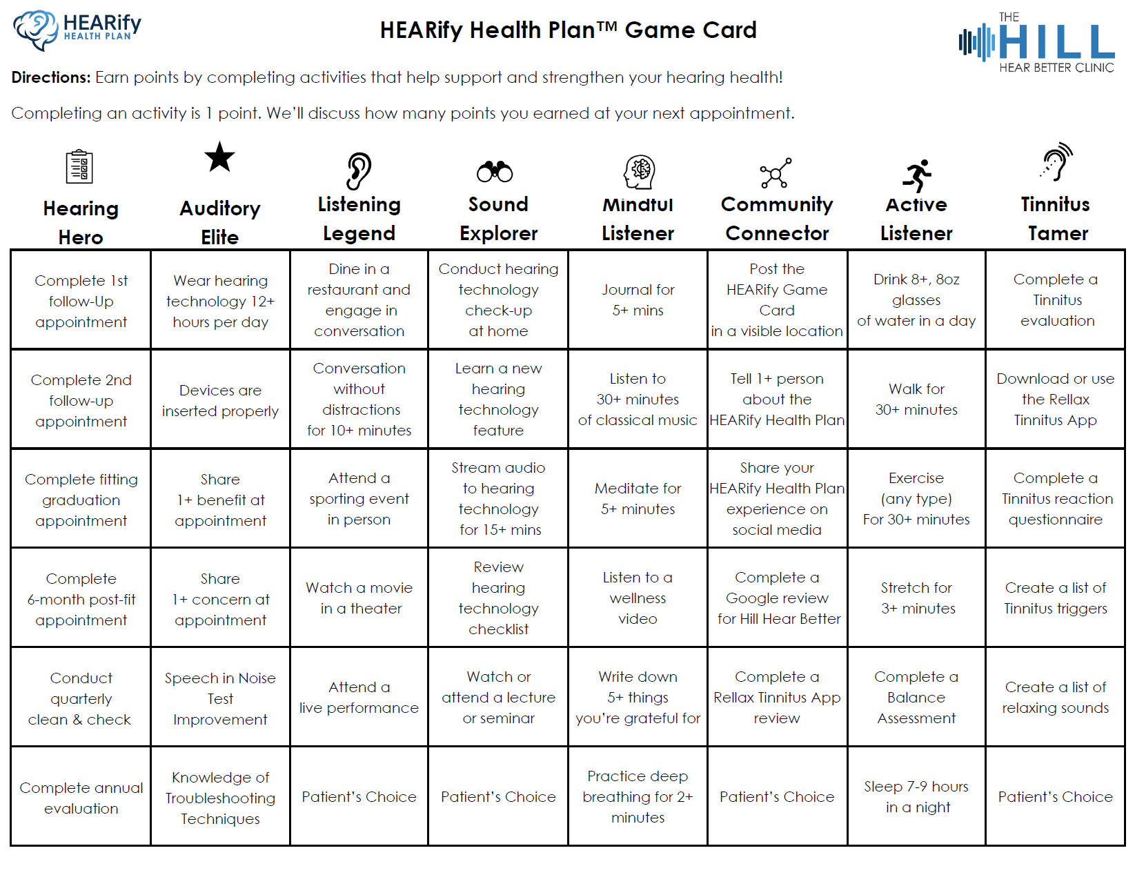 At your first follow-up appointment, you’ll receive a HEARify Health Plan Game Card.
